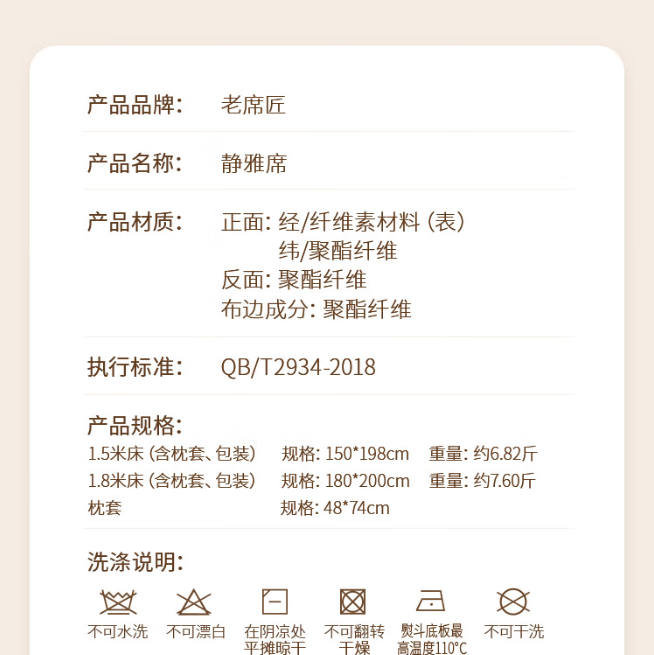 此款凉席品牌为老席匠,静雅席,分为藤席纤维层、蜂窝透气层、排湿透气层三层,足够柔软,也能良好散热,从而带来凉而不冰的体感。婴幼儿A类材质,健康安全。尺寸详情见图片。