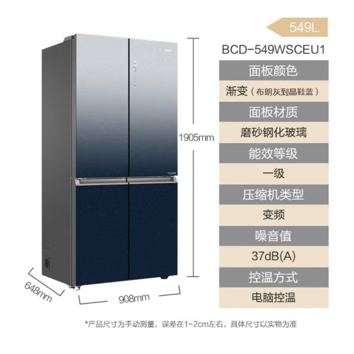 本款产品是一台十字对开门冰箱,面板颜色是渐变(布朗灰到晶鞋蓝),面板材质为磨砂钢化玻璃,能效等级为一级,上下分别为冷藏和冷冻,冷藏区有冷藏区和干(珍品母婴区)湿(果蔬区);冷冻区有冷冻成品区、冷冻生鲜区。全空间保鲜,干湿分储,低氧保湿,新鲜出众,生活向新。