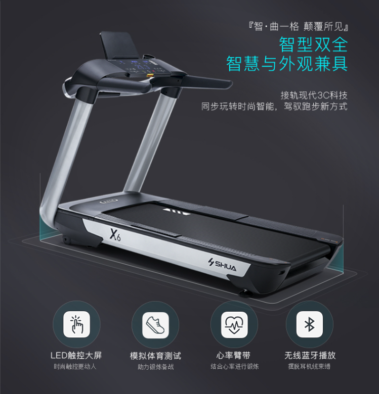 舒华中国奥委会官方健身器材供应商,X6智能跑步机,智型双全,智慧与外形兼顾。外形尺寸2030mm*910mm*1530mm,采用U型粗壮钢立柱、LED触控宽屏、520mm豪华跑带、DC2.5HR高配马达等一些列优秀设计,让你运动时有如私教面对面,让运动者更加轻松上手。中国奥委会官方健身器材供应商